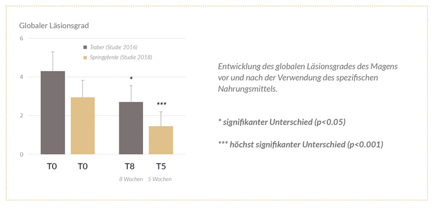FOLLOW UP DER ENTWICKLUNG DES ALLGEMEINENGESUNDHEITSZUSTANDES DER MAGENSCHLEIMHAUTDank der Gastroskopien haben die Tierärzte die glandulären und nicht-glandulären Schleimhäute des Magens beobachten können. Sie haben je nach Schweregrad der beobachteten Läsion Grade (Scores) vergeben. Ein allgemeiner Grad, eine Kombination aller |